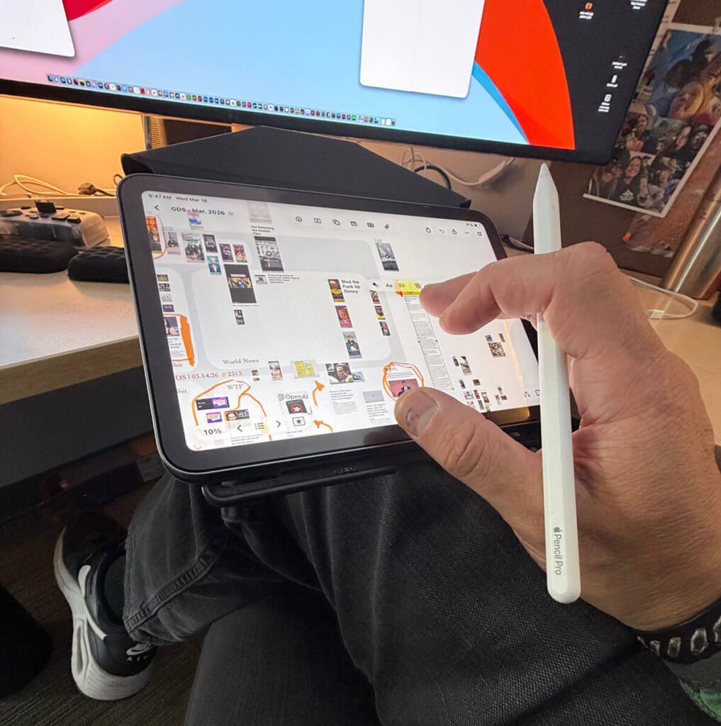 Now, it’s the center of my digital universe. I do drawing and sketching layouts for graphics and print projects right on it with the Pencil Pro. Audio production is next-level: I record from my Zoom Podtrak P4, edit in Ferrite, and handle a complete podcast, from audio tweaks to image creation, all from this tiny piece of glass. It’s a serious game changer. I’ve ditched paper notes too; Freeform and the Notes app have replaced my old pen-and-paper system for reminders, calendars, and brainstorming.